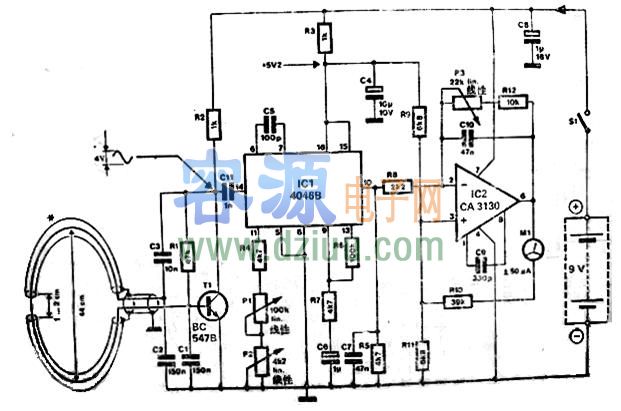 還有一正反饋經微安表和R10加到IC2的非反相輸入。當然,也 不同阻抗的表頭,但要改變R9、R10和R11的值。注意:在探測金屬時,探測物的大小與探測線圈間是有
