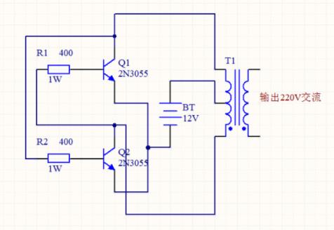 逆變器的制作原理圖如下圖所示,從這里我們可以看到使用到的器件有三極管2N3055,電阻,電源,還有一個(gè)變壓器,(還有開關(guān)在原理圖中沒(méi)畫出來(lái),用來(lái)控制燈的亮滅)元件就這么多,電路也不算是復(fù)雜的。