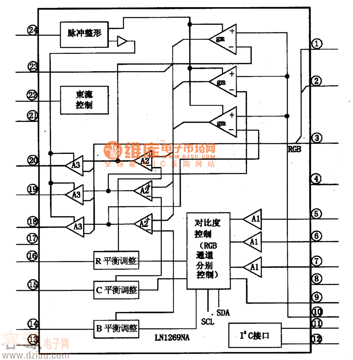 LMl269NA是美國國家半導體公司生產的視頻信號預處理集成電路,廣泛應用于新型計算機顯示器中,如清華同方5E型彩顯等。 1·內電路方框圖 LMl269NA集成電路內含R、G、B三基色平衡調整電路,脈沖整形電路