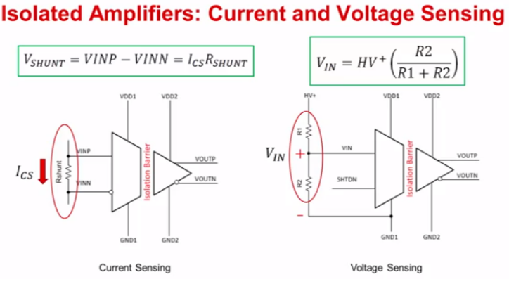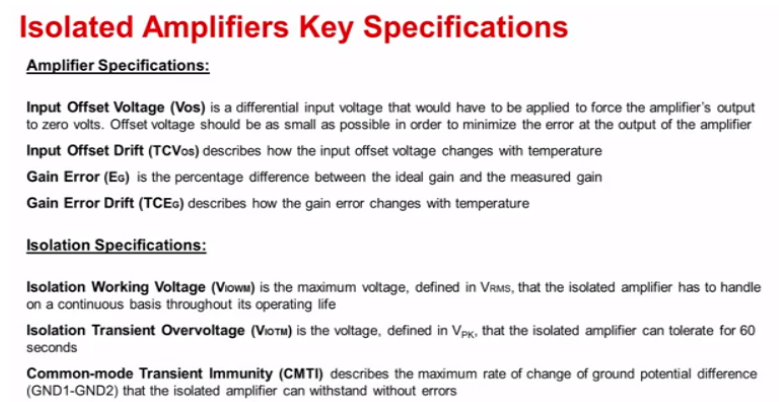 這是隔離放大器的一些常見應(yīng)用示例,電流傳感和電壓傳感。TI提供了各種可實現(xiàn)分流式電流傳感的隔離放大器,其輸入范圍為正負50毫伏或正負250毫伏。隔離放大器的輸入電壓范圍根據(jù)所要測量的電流來確定分流電阻器的值。對于使用分壓的電壓傳感應(yīng)用,TI可提供輸入范圍高達正負12伏的隔離放大器。