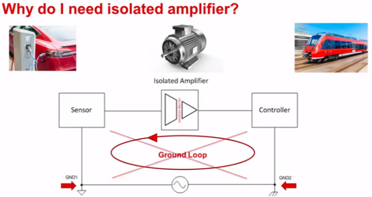 使用隔離放大器的一個常見原因是,為了斷開接地環(huán)路。電氣裝置可以在兩個遠程節(jié)點,接地1和接地2之間產(chǎn)生較大的接地電位差。這兩個接地之間的直接連接會最終形成一個接地環(huán)路。電機一類的設(shè)備可以向地面注入較大的噪聲電流,從而產(chǎn)生在信號路徑中出現(xiàn)的接地環(huán)路電流。隔離放大器可消除來自接地環(huán)路的信號路徑噪聲,保護系統(tǒng)免受接地環(huán)路電位差的影響。
