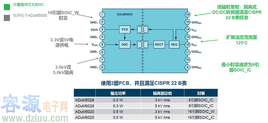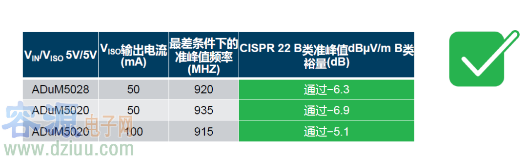 ADI新一代isoPower系列產(chǎn)品 新一代isoPower系列產(chǎn)品采用創(chuàng)新的設(shè)計(jì)技術(shù),可以避免產(chǎn)生大量輻射發(fā)射,甚至在沒(méi)有旁路電容的2層板上也不例外。ADuM5020和ADuM5028在以大幅裕量滿足CISPR22/EN55022B類(lèi)限制的同時(shí),可以分別跨隔離柵提供500mW和330mW功率。