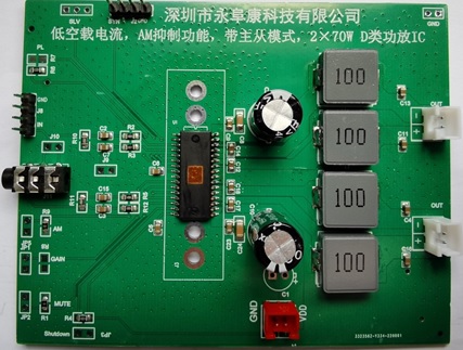 2、采用CS8683兩顆大功率單聲道D類音頻功放IC(單聲道100W用一顆),30V提供2*100W/4歐 ( THD+N=1%)持續功率輸出;