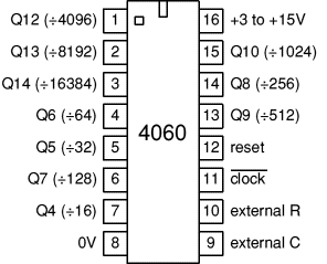 這是CMOS CD4060的電子計時器,它是CMOS 14級紋波傳送二進制計數器/分頻器和振蕩器。輸出QN是計數器的第n級,代表2 Ñ,例如Q4是2 4 = 16(1 / 16的時鐘頻率)和Q14是