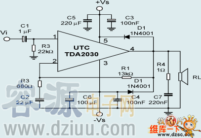單電源供電音頻放大電路是典型應用電路, 由一塊TDA 2030和較少元件組成單聲道音頻放大電路、裝置調整方便、性能指標好等突出的優點。特別是集成塊內部設計有完整的保護電路,能自我保護。