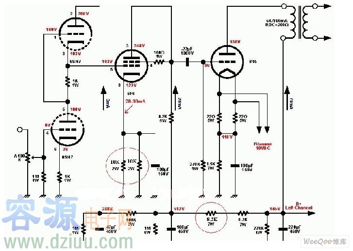 直熱式整流電子管燈絲抽頭高壓電路圖