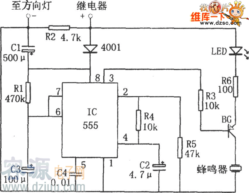 該電路由單穩延時電路、驅動電路、蜂鳴器、發光二極管等組成。其中由555和R1、C3組成的單穩延時電路的輸出信號控制后面電路的工作。  開燈后電路中來自方向燈繼電器的電源通過二極管加至555 ⑧腳,使電容器C3