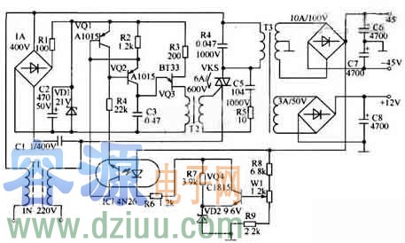如圖所示為性能優越功放電源的電路。它具有體積小、功率大、效率高的特點! 」ぷ髟恚航涣麟娫摧斎虢汿1進行濾波后分成兩路輸出,一路去降壓變壓器T3,在T3的初級回路中串人了雙向晶閘