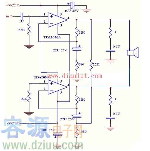 基于TDA2030/TDA2030A組成的BTL中低音功放電路