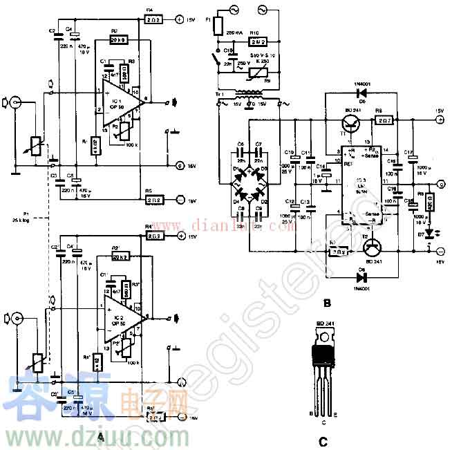 本電路輸入為20V的交流電,經過整流二極管和濾波電容后輸出為直流電壓,再經過穩壓芯片LM7815輸出為穩定電壓15V供放大電路作電源使用。放大電路利用三極管的放大特性,將小信號放大,構成耳放放大電路。 :