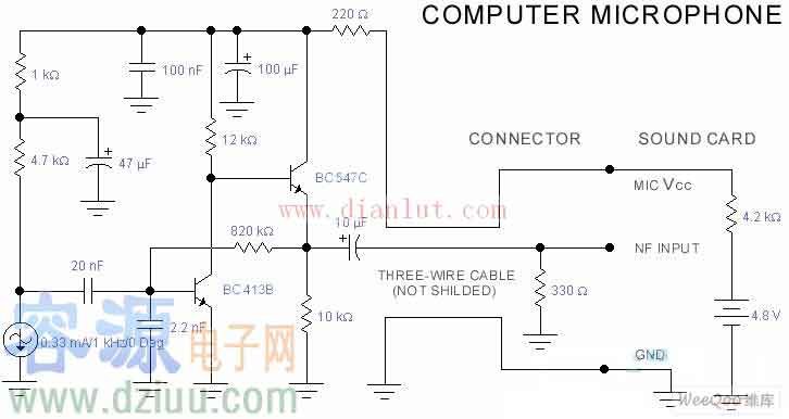 通過PC聲卡通常具有麥克風輸入,揚聲器輸出,有時線路輸入和輸出。麥克風輸入阻抗設計,只有在動態麥克風200至600歐姆范圍。拉扎爾已適應聲卡使用一個共同的駐極體傳聲器使用該電路。他提出了一個復合放大器使用