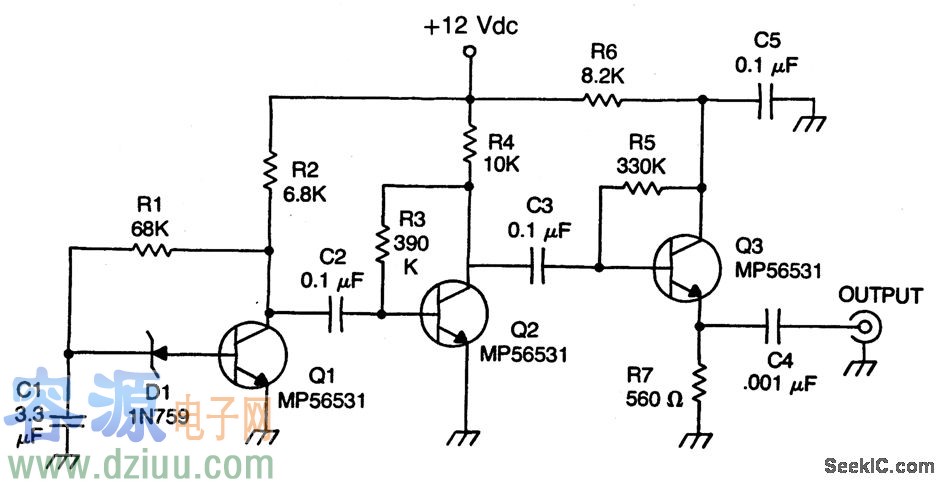 齊納二極管是一個(gè)在反轉(zhuǎn)偏置模式下的整流器,它被連接到寬帶RF放棄大輸入電路上。這個(gè)噪音被放大并應(yīng)用到級(jí)聯(lián)寬帶放大器,晶體管Q2和Q3。 :