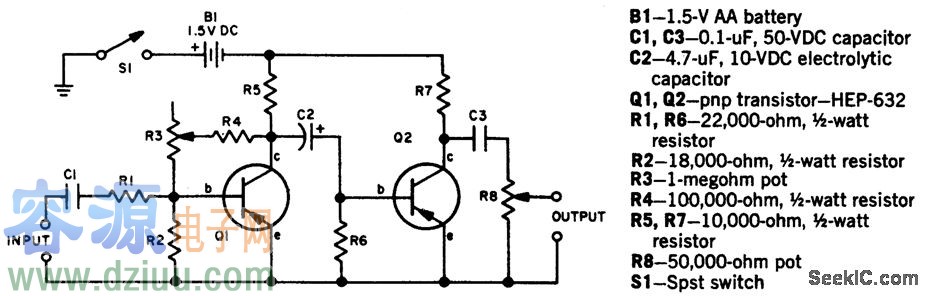 電路說(shuō)明:晶體管可放大輸入信號(hào)。然后兩個(gè)二極管夾住失真輸出,高頻噪音被500 pF的電容從電路中過(guò)濾出來(lái)。正常條件下,1M的滑動(dòng)變阻器可調(diào)整噪音的強(qiáng)度,使其從最高變到零。 :
