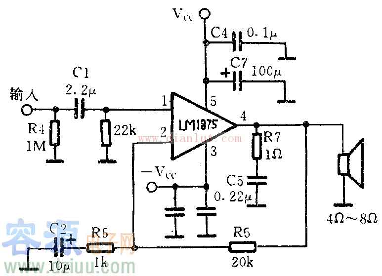 LM1875功率較TDA2030及TDA2009都為大,電壓范圍為16~60V.不失真功率為20W(THD=0.08%),THD=1%時(shí),功率可達(dá)40W(人耳對(duì)THD<10%一下的失真沒什么明顯的感覺),保護(hù)功能完善.筆者是一個(gè)不錯(cuò)的選擇. 其接法同TDA2030相