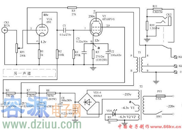 介紹6P14陰極輸出小功率膽機功放電路圖