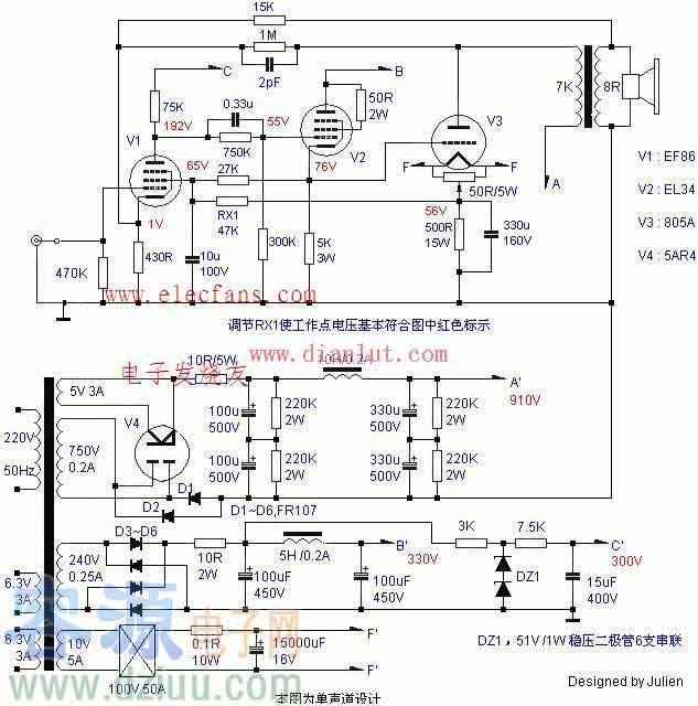 這是一款經過實做,性能尚可的805單端電路,且調試十分簡單。推動級雖然沒有加入負電壓供電,但是抬高了805陰極電位,等效增加了推動范圍。整體施加了少量環路反饋,不會造成音質受損的問題。需要注意保持805燈