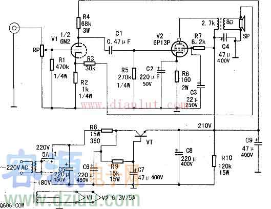 由6P13P設計的膽機功放電路圖如圖。 其具體工作原理為:其采用5A全橋整流。該直流210V電壓經R7降壓、C3、C9濾波,供給6P13P屏柵極工作。經變壓、整流和C5、R8、C6濾波后,再經VT、R9、C7和C8進一步濾波,供給