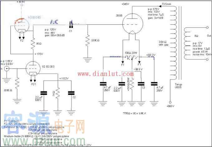 制作時可以先焊接電源與燈絲供電部分,電源正常之后再焊接放大電路,要注意的是,電源空載時,電壓稍高,電容耐壓一定要滿足圖1的要求。該圖所標注的幾個測試點電壓是本人制作時的實測電壓,可作為制作時的參考,在電網電壓變動不大時,應接近上述測試值,這樣成功就不在話下。