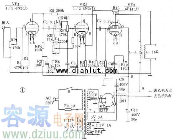 電路是常見的一級輸入放大加長尾倒相推動功放管。小管子是國產的6N1,功放管子也是國產的6P3P,輸出功率是25W! 6P3P:旁熱式陰極束射四極管/低頻功率放大。 :
