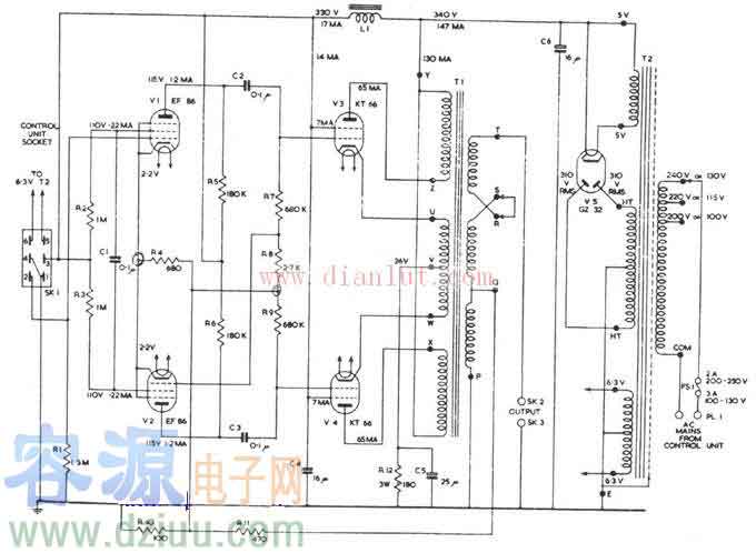 由電源變壓器次級輸出的雙250V電壓經5Z3P全波整流,輸出100Hz的單向脈動直流經C6、L1、C7組成的CLC-π濾波器得到平穩的直流高壓。電子管整流在開機時經歷預熱過程而無高壓沖擊,具有保護電子管的作用,這一點在功放電路使用天價電子管時顯得尤為重要。CLC-π型濾波方式濾波效果好,電源內阻低,對降低噪音,提高整機動態有極大的益處。R7、R8的作用是保護C6.R9為高阻值的高壓泄放電阻。防止開機高壓的峰值脈沖電壓對功率管和輸出變壓器的沖擊。