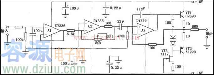 如圖所示電路是功放前級的其中一路放大電路。電路采用3只DY336低噪聲、高品質(zhì)運放。其中A1用作輸入信號的緩沖跟隨器,以減輕信號源的負(fù)擔(dān)。A2和RPl組成負(fù)反饋音量調(diào)節(jié)器,這種音量的調(diào)節(jié)方式能減小RPl阻值變化所