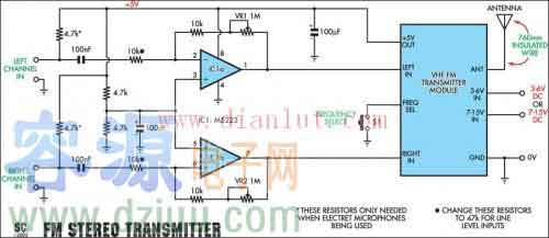 如圖所示電路是立體聲調頻無線麥克風,我們測試它超過50米,它的音響,提供出乎意料的好音質。 :
