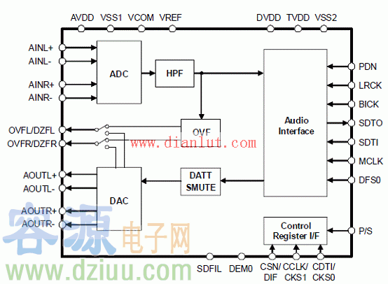 AK4621是高性能 24位立體聲音頻CODEC,支持192kHz錄音和播放,器件具有兩路24位ADC和24位DAC,全差分輸入和可選擇的數字濾波器(數字濾波器是一個離散時間系統(按預定的算法,將輸入離散時間信號轉換為所要求的輸