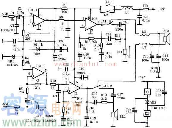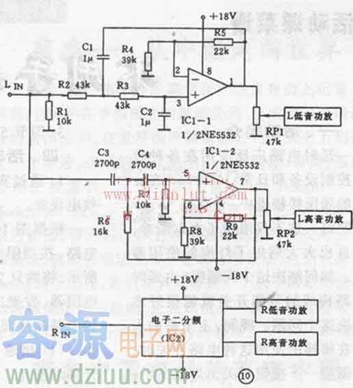上圖所示為電子二分頻功率放大器的圖解。與傳統(tǒng)分頻方法相比,在功效前采用電子分頻器,則完全避免了功放后LC分頻器的大電流信號、體積大、制作成本高、制作和調(diào)試?yán)щy、插入損耗和功效的阻尼特性變差的缺點(diǎn),并