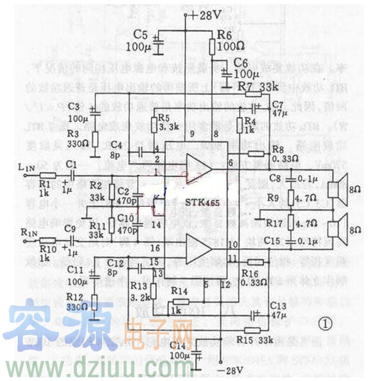 圖是2×30W雙聲道音頻功率放大器,其核心器件ICl采用高保真音響功放集成電路STK465,該電路內(nèi)包含兩個性能指標(biāo)完全相同的功率