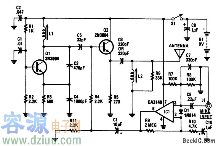 晶體管Q1和其相關組件包含一個可調諧的振蕩器。射頻信號被傳送到晶體管Q2,調制器。運算放大器IC1增加了音頻信號,然后通過電阻R4應用到Q2的基極。 :