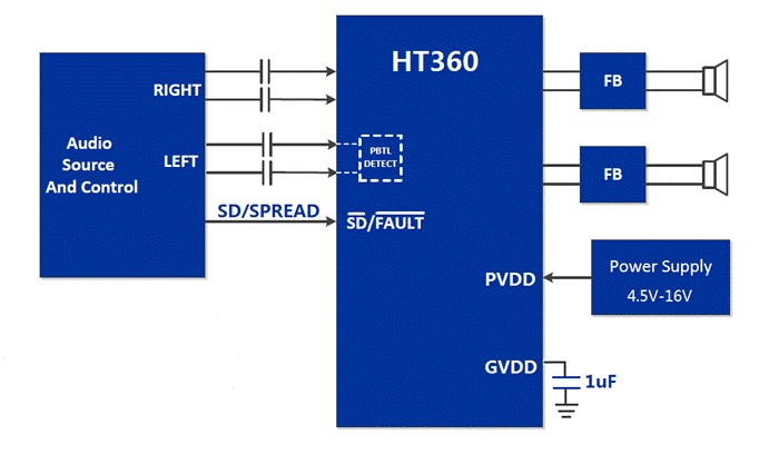 HT566 2x20W立體聲I2S數(shù)字輸入無電感閉環(huán)D類音頻功放I