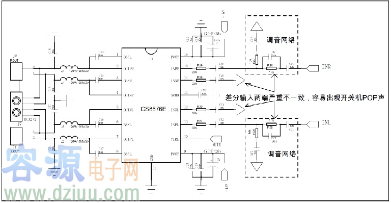 大部分D類功放都是差分輸入,如果差分輸入兩端參數(shù)不一致,功放上電,掉電時兩邊充放電時間不一樣。兩邊相減后就會現(xiàn)額外的電信號,這個電信號再經(jīng)功放放大到喇叭端就會出現(xiàn)POP聲。所以盡量保持差分兩端網(wǎng)絡(luò)以及參數(shù)一致。如果主控解碼輸出是單端信號,又有復(fù)雜的調(diào)音網(wǎng)絡(luò),建議用運放隔離可以克服這個問題。