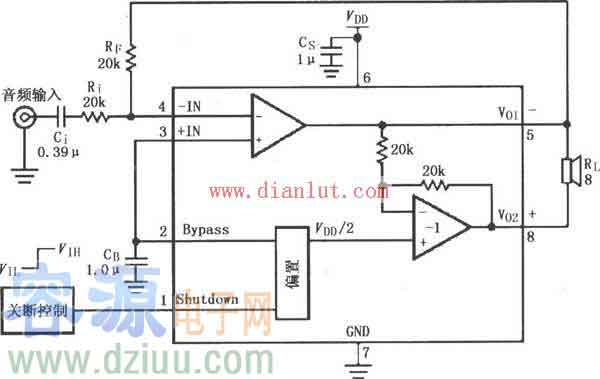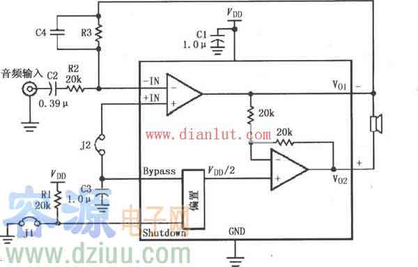 工作原理:只要增大R3即可提高放大器的增益。在R3兩端并聯電容C4,用于對高頻提供低阻通路濾波,防止高頻自激。J1為跳線,當J1接通時,1腳接地,全功率放大工作;當J1斷開時,1腳為VDD,微功耗關斷,放大器不工作