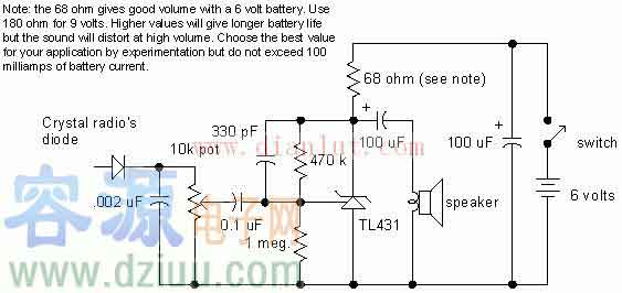 使用TL431分流穩壓器設計的音頻放大器。該放大器可提供房間內的水晶,從一個普通的一個長線天線和配備良好的地面收音機的音量。在復雜的電路是類似于一個簡單的晶體管收音機,但其性能遠遠優越。TL431的是在一個