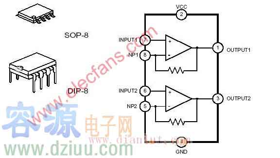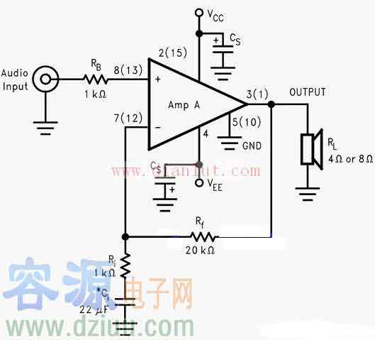 工作原理:音頻信號輸人后,經過Ci、Ri耦合加到放大器的反相輸入端(4腳),而放大器的同相輸入端(3腳)則交流接地,放大后的信號從5、8腳輸出。5、8腳之間接負載,如揚聲器,由此構成反相功率放大電路。為了避