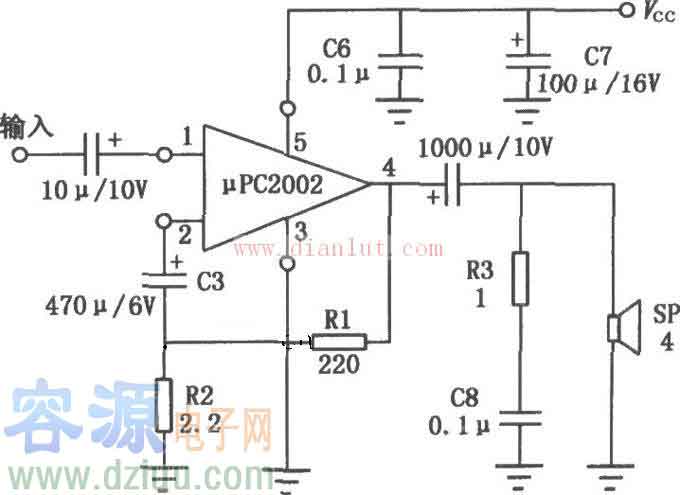 本電路采用音頻功率放大集成電路μPC2002,采用5腳單列直插塑料封裝,按引線的形狀可分為H型與V型。該電路輸出功率大、失真度小,噪聲低,開機時沖擊聲小,并具有電源浪涌、過電壓和負載短路等保護電路,因而廣泛