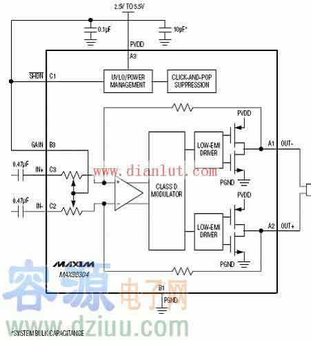 MAX98304單聲道、3.2W、D類放大器能夠以D類放大器的效率提供AB類放大器的音頻性能。器件提供5種可選增益設置(0dB、3dB、6dB、9dB和12dB),由一個增益選擇輸入(GAIN)設置