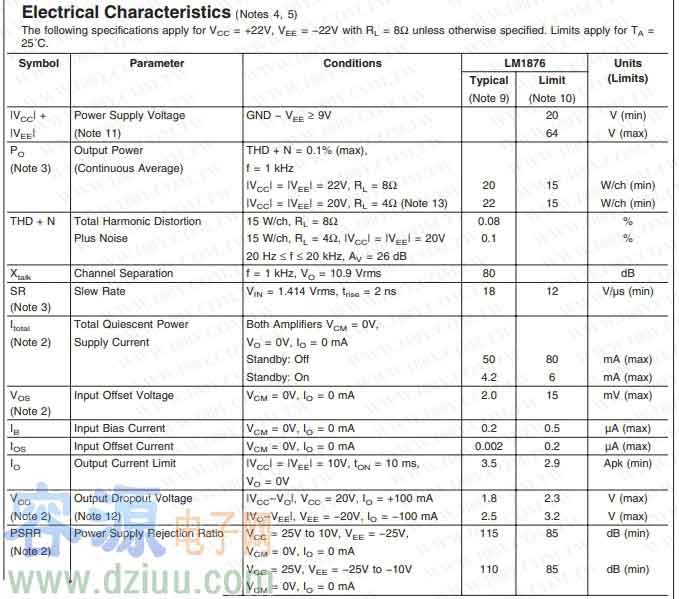 LM1876能夠在4~8歐負(fù)載上每聲道輸出20W的連續(xù)功率,且諧波失真小于0.1% ,是一個(gè)立體聲音頻放大器, 供電范圍20V-64V (+和-相加,即相當(dāng)于+10V至+32V),BTL應(yīng)用電路下,可以輸出40W左右的功率。