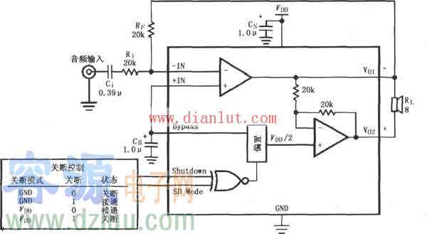 工作原理:音頻信號輸入后,經過C2耦合加到放大器的反相輸入端(4腳),功率放大后從Vo1(5腳)和Vo2(8腳)以電橋輸出的形式加到揚聲器。LM4906內部有兩個放大器,第一個放大器的增益可由增益選擇端(3腳)控制,3腳為低電平時增益是6dB,3腳為高電平時增益是12dB。第二個放大器增益由內部兩個20kΩ電阻固定為1.LM4906以電橋差動形式輸出時,功率放大器的增益Av為2×20kΩ/20kΩ或2×40kΩ/20kΩ。當1腳為邏輯低電平時放大器微功率關斷,為邏輯高電平時放大器全功率工作。
