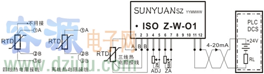 ISO Z-W-O1 采用電磁隔離模式及高效能后級饋電發明專利技術,無需獨立電源供電即可實現熱電阻傳感器輸出的溫度信號到 4-20mA 標準信號的精準隔離轉換,可以直接同各類常用儀器儀表的模擬量輸入端口(如PLC、DCS系統等)相匹配。IC內部包含信號調制解調電路、信號耦合隔離變換電路、高效能的DC-DC升壓電路、信號零點、滿度校準電路和Pt100熱電阻線性化、長線補償、干擾抑制電路等。輸出回路供電電壓范圍寬(12-36VDC)、轉換精度高、線性度好,滿度和零點由用戶通過外接電位器現場調節和校準。
