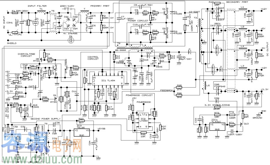 為了讓讀者能夠更好的理解電源設計的工作原理,本文重點介紹一款典型的低端ATX電源設計電路圖。如下圖所示,PWM電路已經肩負起了電壓整流的工作。輸入電壓在經過開關管之前將會再次校正,而且進入變壓器的電壓已經成為方形波。所以,變壓器輸出的波形也是方形波,而不是正弦波。由于此時波形已經是方形波,所以電壓可以輕而易舉的被變壓器轉換為DC直流電壓。也就是說,當電壓被變壓器重新校正之后,輸出電壓已經變成了DC直流電壓。這就是為什么很多時候開關電源經常會被稱之為DC-DC轉換器。饋送PWM控制電路的回路負責所有需要的調節功能。如果輸出電壓錯誤時,PWM控制電路就會改變工作周期的控制信號以適應變壓器,最終將輸出電壓校正過來。這種情況經常會發生在PC功耗升高的時,此時輸出電壓趨于下降,或者PC功耗下降的時,此時輸出電壓趨于上升。