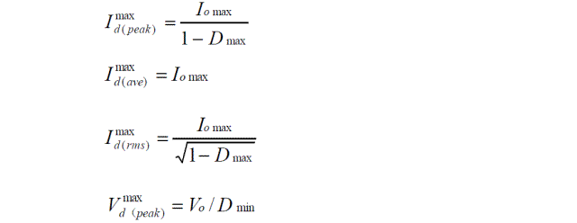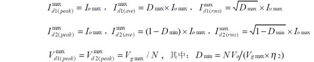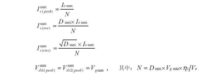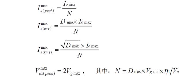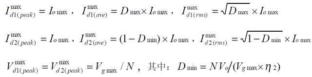 上述公式是穩態工作時,功率器件上的電壓、電流應力。選擇功率器件時,其電壓耐量可放一個合適的余量(保證最壞情況下的電壓峰值不超過此值),電流耐量則得按器件的結溫降額要求決定、它與外部散熱條件和器件的通態電阻、通態壓降、結電容、反向恢復、結到殼的熱阻等密切相關,是功率器件熱設計的內容,將在以后的欄目中介紹。