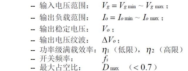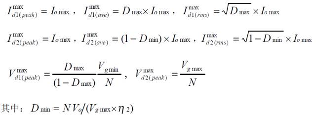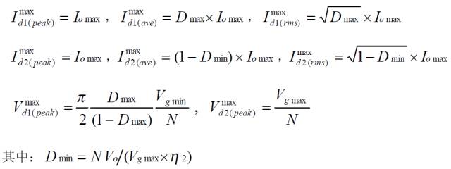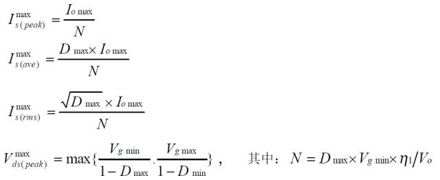 上述公式是穩態工作時,功率器件上的電壓、電流應力。選擇功率器件時,其電壓耐量可放一個合適的余量(保證最壞情況下的電壓峰值不超過此值),電流耐量則得按器件的結溫降額要求決定、它與外部散熱條件和器件的通態電阻、通態壓降、結電容、反向恢復、結到殼的熱阻等密切相關,是功率器件熱設計的內容,將在以后的欄目中介紹。