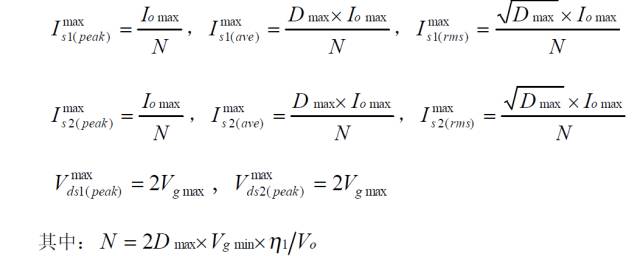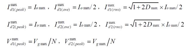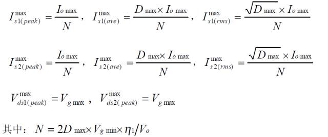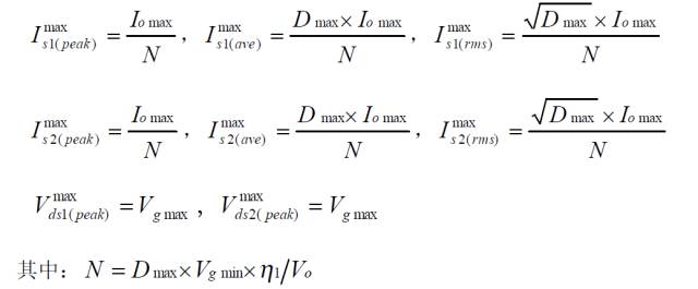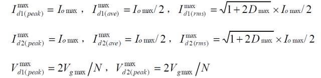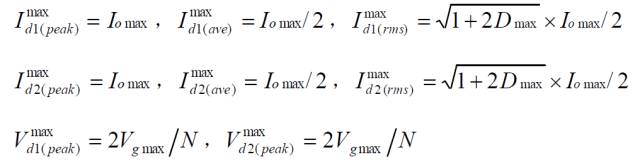 上述公式是穩態工作時,功率器件上的電壓、電流應力。選擇功率器件時,其電壓耐量可放一個合適的余量(保證最壞情況下的電壓峰值不超過此值),電流耐量則得按器件的結溫降額要求決定、它與外部散熱條件和器件的通態電阻、通態壓降、結電容、反向恢復、結到殼的熱阻等密切相關,是功率器件熱設計的內容,將在以后的欄目中介紹。