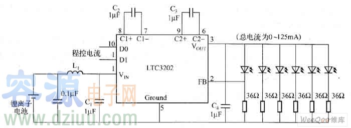 圖 采用LTC3202電荷泵的鋰離子電池供電驅(qū)動白光LED電路容源電子網(wǎng)m.flswjt.cn
