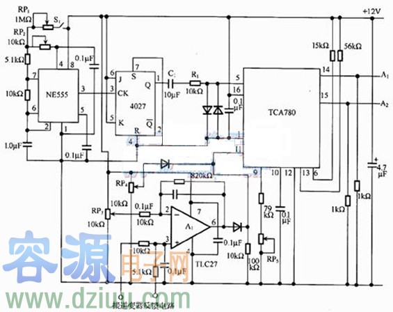采用TCA780集成芯片簡單構成PWM電路。逆變器的反饋電壓經誤差放大器A1放大后輸入到PWM電路中。NE555是產生同步信號的振蕩器,振蕩頻率是輸出頻率的2倍。輸出頻率為50 Hz時,振蕩頻率為1