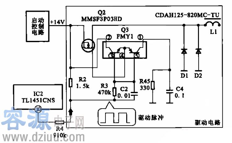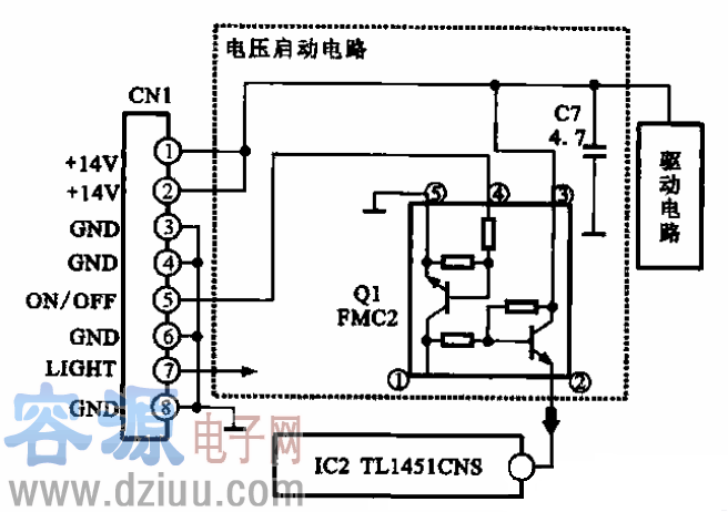 上圖所示為逆變器的電壓啟動電路,它主要元器件為Ql,主要作用是為PWM控制芯片(TL1451CNS)提供啟動信號。 在接通電源啟動顯示器時,插件CNI的⑤腳接收到控制電路傳來的高電平開啟指