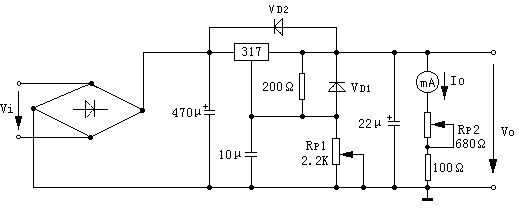 電路工作原理:220V交流電經變壓器T降壓后,得到24V交流電;再經VD1~VD4組成的全橋整流、C1濾波,得到33V左右的直流電壓。該電壓經集成電路LM317