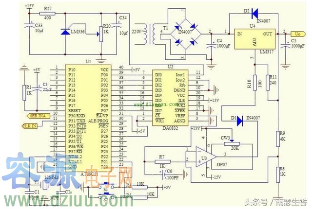 電路圖一: 整個電路通過單片機(AT89C51)控制,P0口和DAC0832的數據口直接相連,DA的CS和WR1連接后接P26,WR2和XFER接地,讓DA工作在單緩沖方式下。DA的11腳接參考電壓,通過調節