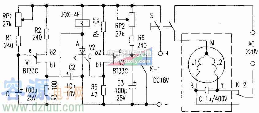 附圖所示電路可用于洗衣機(jī)或需要吸氣/排氣的風(fēng)扇電機(jī)定時自動換向運(yùn)轉(zhuǎn)電路。圖中虛線框內(nèi)是電機(jī)M的電原理圖,C為裂相電容器,用作產(chǎn)生旋轉(zhuǎn)磁場使M轉(zhuǎn)動。L1、L2是參數(shù)完全相